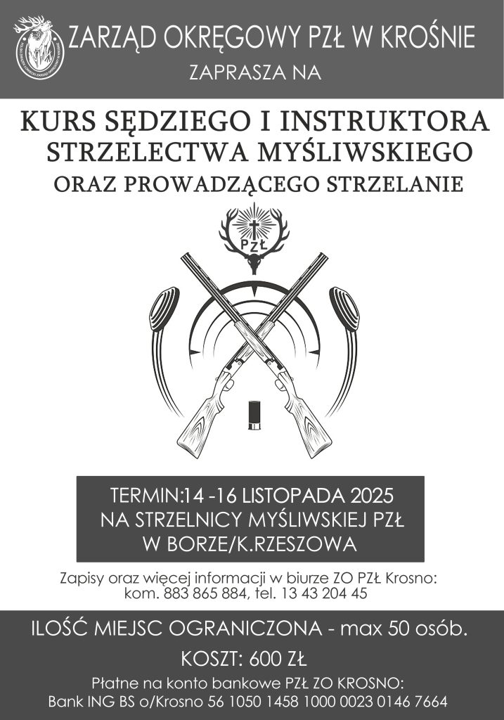 Zarząd Okręgowy Polskiego Związku Łowieckiego w Krośnie informuje, że w dniach 14–16 listopada 2025 r. (piątek-niedziela) na Strzelnicy Myśliwskiej w Borze k. Rzeszowa odbędzie się szkolenie organizowane w celu uzyskania uprawnień Sędziego i Instruktora oraz Prowadzącego Strzelanie w Polskim Związku Łowieckim, zgodnie z uchwałą Naczelnej Rady Łowieckiej nr 358/2021 z dnia 10 maja 2021 r.